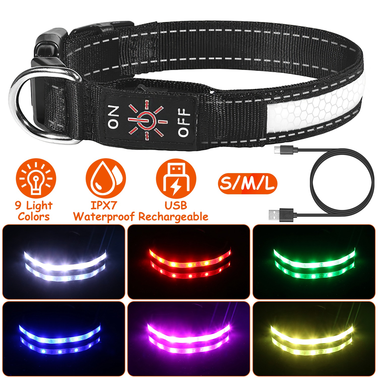 Light Up Dog Collar LED Dog Collar Safety Night Glowing Dog Collar with 9 Light Colors IPX7 Waterproof USB Rechargeable S/M/L