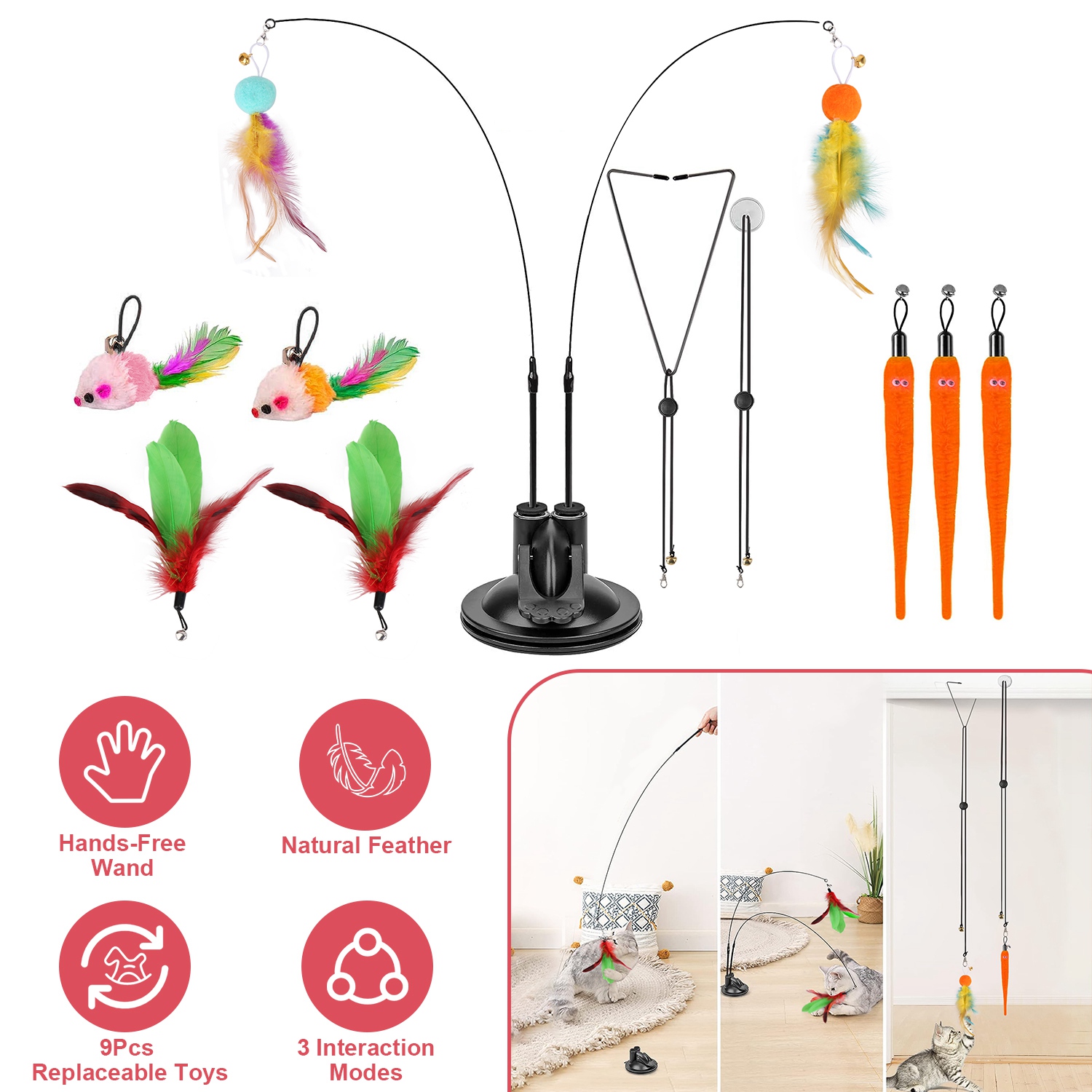 Home > 2 Cat Wand Toys with Suction Cup Double Head Interactive Cat Feather Toy 9Pcs Teaser Replacements with Bell Cats Self Playing Hanging Indoor Cat Toy