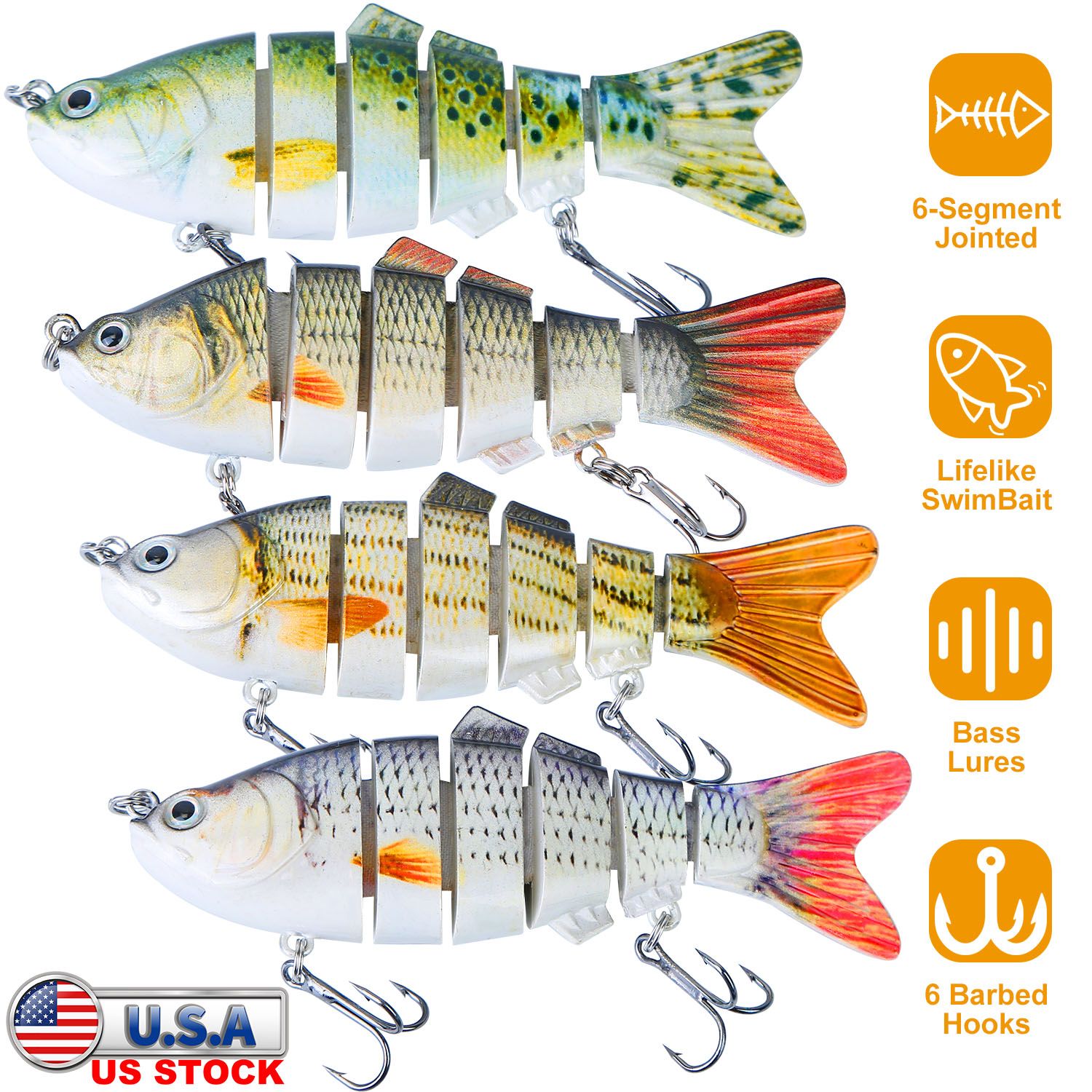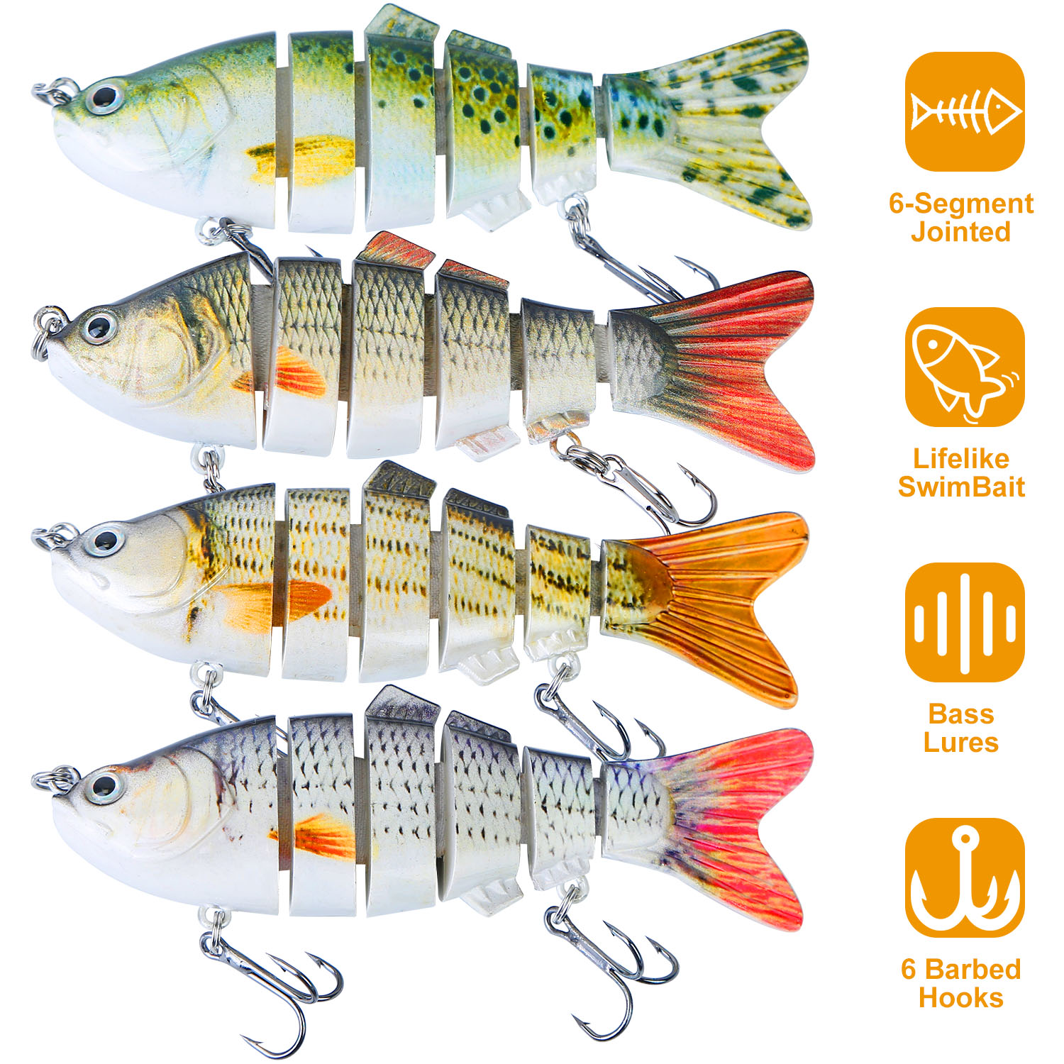 Designed with 6 segmented body sections, our swim-baits with lifelike appearance, are the latest innovative fishing lures which make fishing easy. The lure can make a great action in the water and attract predator fishes to attack. Sharp Mustad hooks make sure easily piercing and hard to escape. Suitable for seawater and freshwater, wonderful bait for enthusiastic sports fishermen.