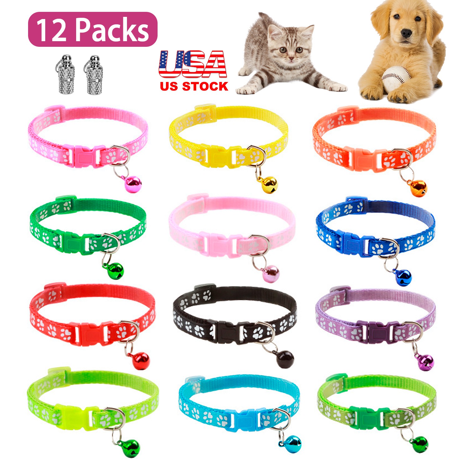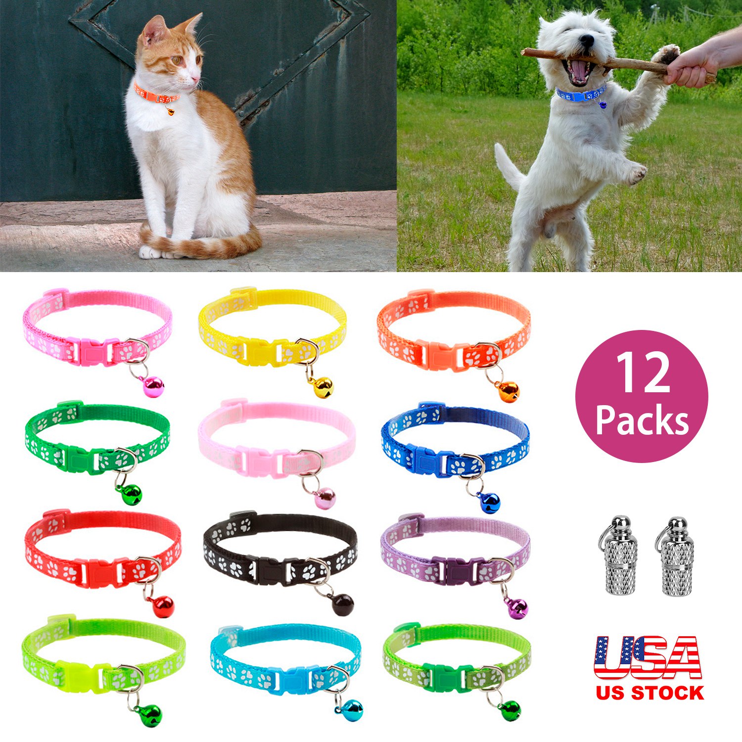 Use this cute collar and never lose your cat again! With a ringing bell and a name tag, you can easily find your kitty! Quick release buckle adds more security for your cat. Cute paw pattern and 12 colors can match your pet daily wear, helping your pets live the vibrant life!