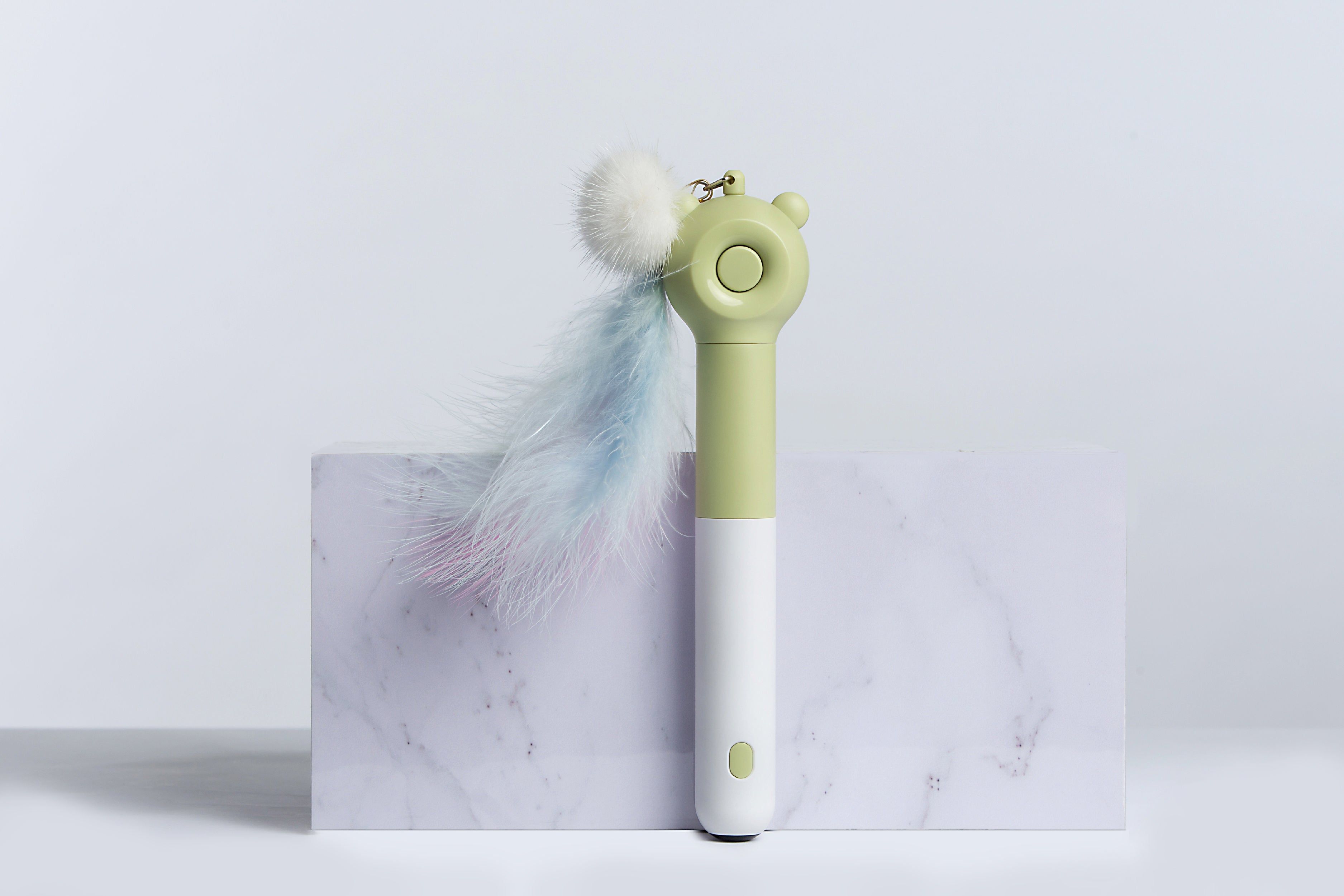 1.The above top Feather and Pom-Pom Cat Teaser attachment retracts and detracts at the press of a button through a built-in string and locks into place