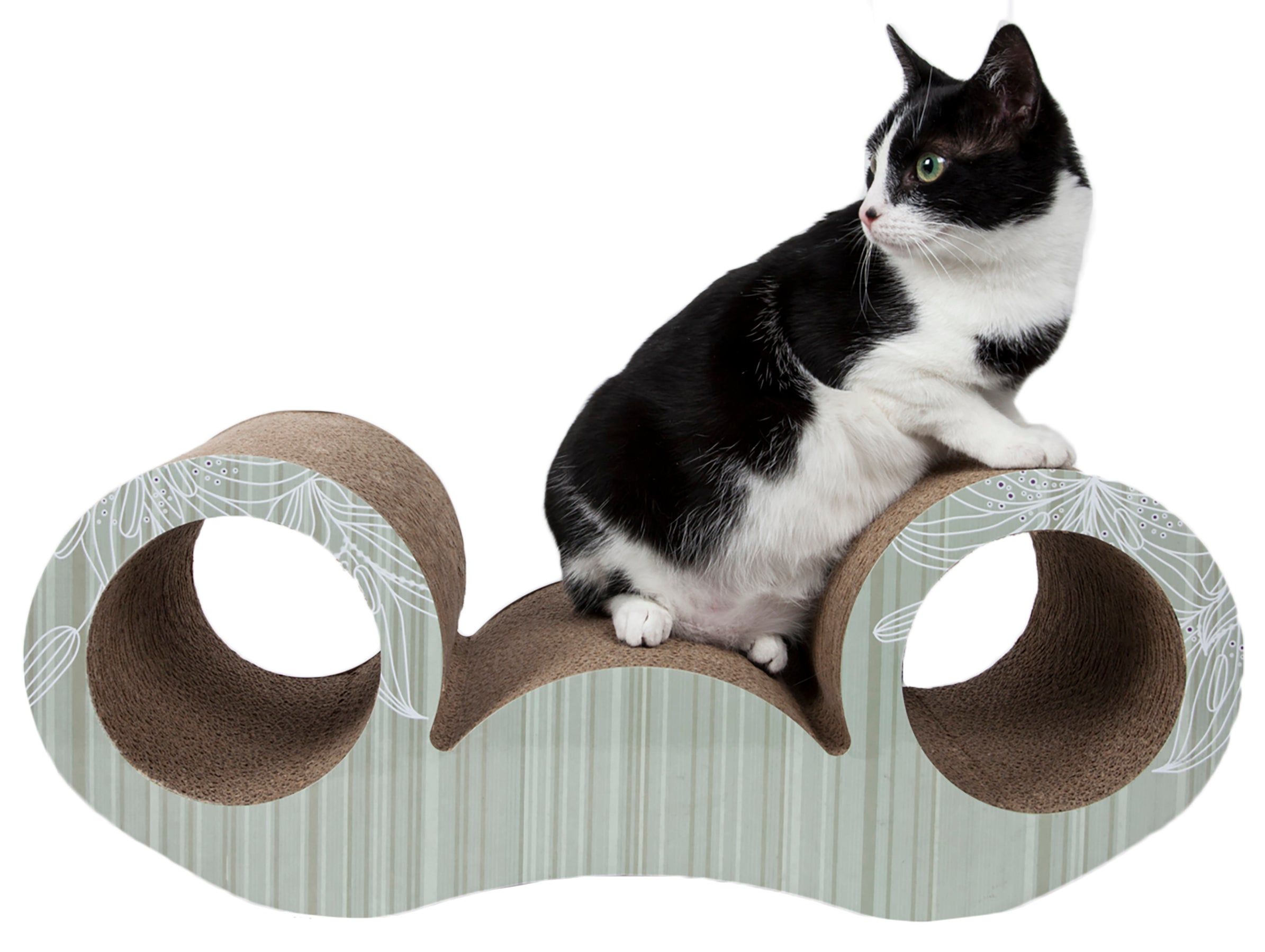 The Pet Life Binocular Ultra Premium modern exquisite contoured cat scratcher lounger is composed of ultra-premium and durable recycled cardboard featuring Non-Toxic glue made of corn starch. Features a Binocular modern curved body-like structure with three lounging areas which makes it easy for scratching or lounging on while looking great as a home furniture piece. Constructed with superior cardboard and built-to-last longer than the conventional cat scratcher. Features a nice size large enough for multiple cats. Comes with an organic catnip device. Great for exercising and keeping paws healthy.